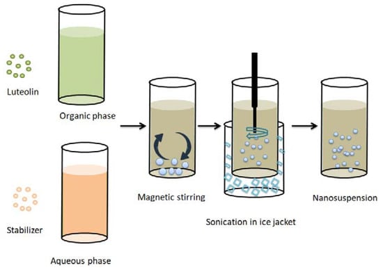 Schematic representation of the antisolvent/precipitation sonication method used for the preparation of LT-loaded nanosuspensions.