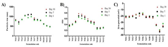Stability studies of LT-loaded nanosuspensions over the course of 1 month (n = 3, ± SD): (A) particle size, (B) PDI, and (C) zeta potential.