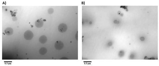 The morphology of the selected formulations was investigated via transmission electron microscopy (TEM, JEOL JEM 1010S, JOEL Ltd., Tokyo, Japan). NS2 and NS12 were firstly diluted and shaken to obtain homogenous diluted dispersions. Then, the diluted samples were dropped onto a carbon-coated copper grid and allowed to dry. The dried films were fixed to the holder and photographed by TEM.