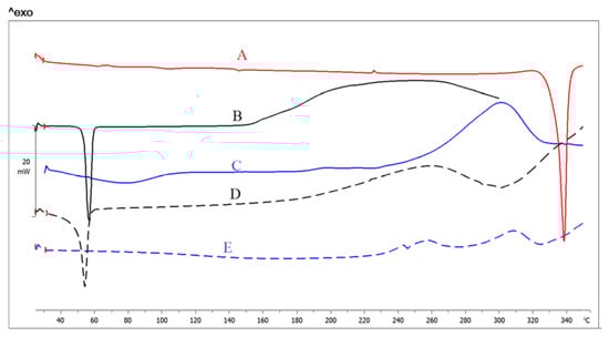 DSC is a key tool used to establish the crystalline/amorphous state of substances, as well as the probable interactions between drugs and carriers through finding the changes in phase transition temperature. Figure 4 shows the thermograms of LT, pure stabilizers, and NS2 and NS12. Pure LT shows a main sharp endothermic peak at 335 °C (Figure 5A), which correlates with the drug melting point [] and crystalline state. Pluronic F127 exhibits a sharp endothermic peak at 55 °C and a broad exothermic peak at 182 °C (Figure 5B). Alginate (Figure 5C) shows a broad endothermal peak at 90 °C, representing water loss, followed by a sharp exothermic peak at 251 °C, representing degradation of polyelectrolytes via dehydration, depolymerization reactions, partial decarboxylation of the protonated carboxylic groups, and oxidation reactions of the polyelectrolytes []. NS2 and NS12 show a decrease in the LT endothermic peak, which was broadened and observed at lower temperature than that in the pure LT thermogram. This finding suggests a less crystalline structure of LT in lyophilized NS2 and NS12. It may be also attributed to scale-down of the particles into the nanometer range [] as a result of the effect of efficient stabilizers. Active pharmaceutical ingredients fabricated by an antisolvent precipitation technique exhibited analogous phenomena [].