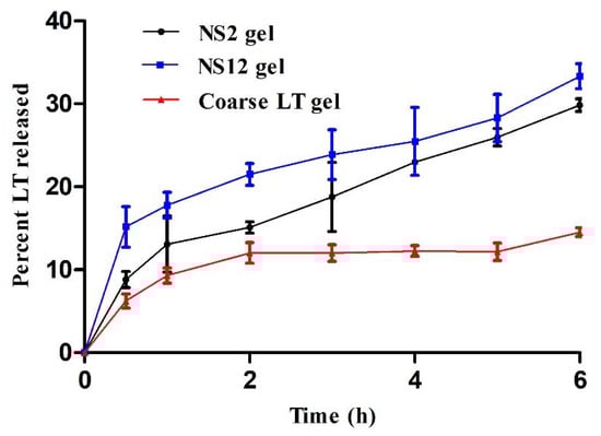 In vitro release profiles of LT from NS2, NS12, and coarse LT gels (mean values ± SD, n = 3).