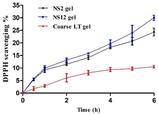 Luteolin exhibits antioxidant activity owing to the presence of ortho-dihydroxy functional groups in the B-ring and the 2,3-double bond in conjugation with the 4-oxo function of the C-ring []. The antioxidant efficacy associated with in vitro release media of the NS2 gel, NS12 gel, and coarse LT gel is depicted in Figure 7. Both NS2 gel and NS12 gel showed higher DPPH scavenging activity (24.3% and 30%, respectively) when compared to coarse LT gel (10.5%) after 6 h. The antioxidant activity was consistent with the concentration of LT released at the corresponding time points. This can reflect two things. The first is that LT is stable in release media, at least for the experiment period (6 h), evidenced by its retained antioxidant activity. The second is that NS gels can prolong the effect of LT via releasing effective concentrations over an extended period of time, instead of fluctuations on a short time interval.