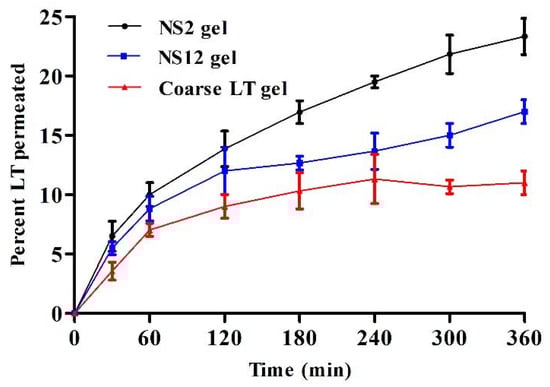 Ex vivo skin permeation of LT as a percentage through full-thickness skin samples versus time for NS2, NS12, and coarse LT gels (mean values ± SD, n = 3).