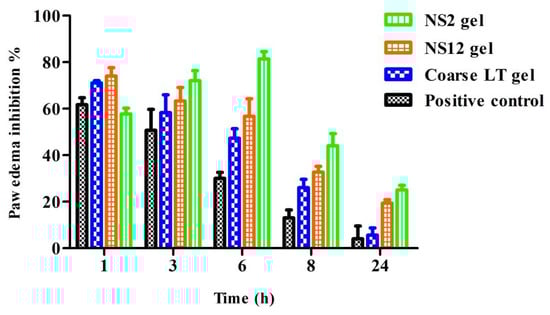 The anti-inflammatory effect of all investigated gels was evaluated in a carrageenan-induced rat paw edema model (Figure 9). In the positive control group, the sizes of the paw edema increased progressively and reached a peak at 8 h after carrageenan injection (percentage edema inhibition was 13.07 ± 3.4%). All investigated gels produced a decrease in paw edema volume when compared to the positive control group. The maximum edema inhibition percentage was found in the NS2 gel group at all time points, while coarse LT gel showed the lowest edema inhibition percentage. At time point 6 h, maximum edema inhibition was observed in the NS2-gel-treated group (81.33 ± 5.6%). LT can induce an anti-inflammatory effect through inhibition of nitric oxide (NO) and other inflammatory cytokines, such as tumor necrosis factor alpha (TNF-α) and interleukin-6 (IL-6), and inhibition of protein tyrosine phosphorylation and nuclear transcription factor KB (NF-KB)-mediated gene expression [].