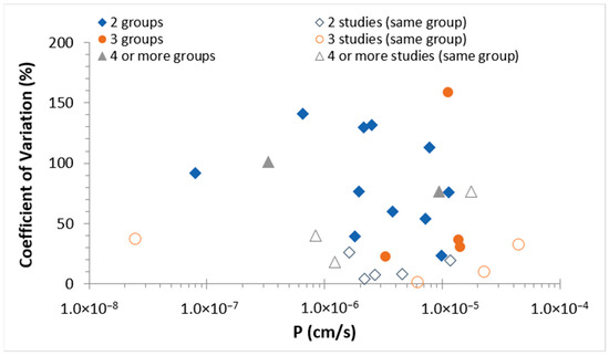 For the permeability analyses in the present review, when the permeability data were from different studies of the same research group, the average value of the permeability coefficients published in these studies was calculated and used as an individual data point. When the permeability data were from different research groups, the result from each research group was treated as an individual data point in the analyses; these data were analyzed as separate data points with the same weighing factor as if they were different permeants.