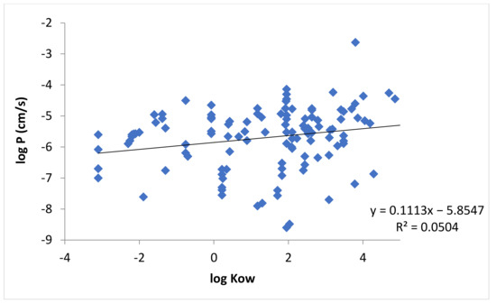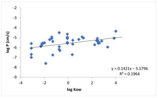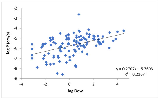 Figure 2 shows the relationship between the permeability coefficients of buccal mucosa and the lipophilicities of the permeants in Table A1, in which the lipophilicities are measured by Kow. The correlation between log P and log Kow was poor. By taking into account the fraction of ionization of the permeants, Figure 3 shows the relationship between the permeability coefficients and Dow of the permeants. The correlation between the permeability coefficients and lipophilicities of the permeants improved when Dow (instead of Kow) was used (Figure 3 vs. Figure 2), but the correlation was still relatively poor.