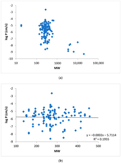 (a) Relationship between log P and MW for all applicable permeants in Table A1. (b) Enlarged figure to evaluate the relationship between log P and MW of permeants in the 130–460 Dalton range.