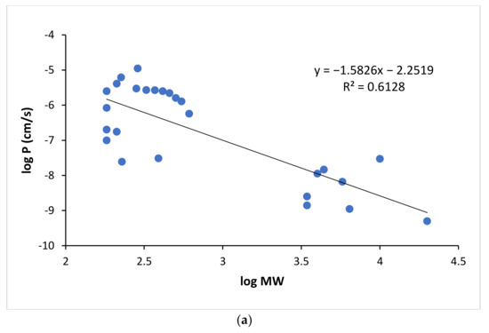 The permeation of macromolecules across a biological membrane is anticipated to be through the paracellular route of the membrane. This transport pathway can be modeled by the polar pathway and hindered transport theory (Equations (7) and (8)). Figure 6a presents the relationship between the permeability coefficients and MW of the macromolecules and the polar permeants that have log Kow < −1 and are not pH dependent (i.e., not weak acid or weak base) for the buccal mucosa. With the inclusion of the macromolecules in the permeability analysis, unlike the analysis of only small permeants, a steep size dependence of permeability was observed with a linear regression slope of −1.58 and R2 = 0.613 for the log P vs. log MW relationship.