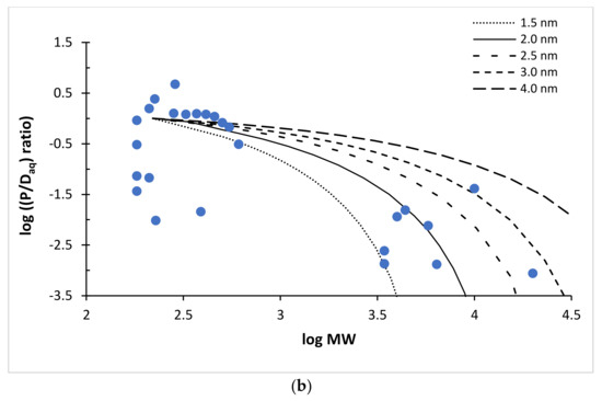 (a) Relationship between log P and log MW of polar permeants (pH independent and log Kow < −1) and macromolecules from Table A1. (b) Comparison of the log (P/Daq) ratio and log H ratio vs. log MW of the polar permeants and macromolecules. The reference P/Daq and H values in (b) are those of a hypothetical small permeant with permeability coefficient and MW equivalent to the average values of the permeants with MW < 300 Dalton in (a). Symbols: experimental P/Daq ratio data. Lines: H ratios calculated with pore radius of 1.5 nm (dotted), 2 nm (solid), 2.5 nm (dash-dot), 3 nm (short dashes), and 4 nm (dashes) using Equation (8).