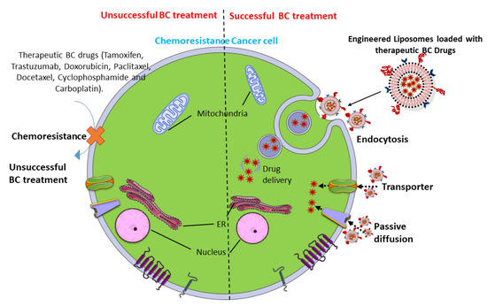 NPs normally encounter a cell and are rapidly adopted through endocytosis. Later, they transport to other cell organelles such as the nucleus, mitochondria, endosomes, lysosomes, Golgi apparatus, and endoplasmic reticulum. This transport usually facilitates the movement of vesicles along the network of the lysosome. During intracellular transport, nanocarriers undergo rapid degradation and release their payload into the organelles. Remarkably, nanocarrier surfaces can be activated with a ligand to target an exact cell organelle. Nowadays, endocytic-mediated pathways are very common, as these approaches overcome chemoresistance to drug uptake in BC cells.