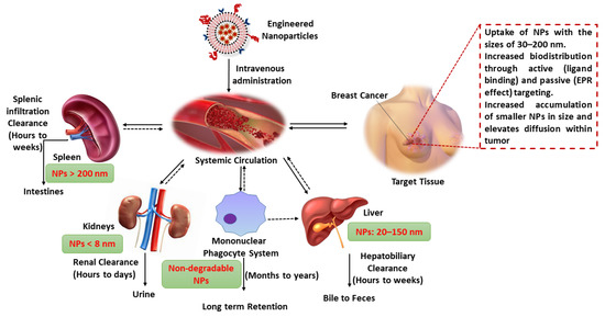Therapeutic NPs directly pass into the circulatory system, diffusing through the vascular walls into the target lesion and discharging the payload. Owing to their huge size, NPs cannot diffuse into endothelial cells. However, intracellular vessels in the tumor site cover leaky walls, permitting NPs with the precise sizes to diffuse effectively [106]. Due to the absence or dysfunction of the lymphatic system at the tumor site, inadequate drainage generally eases the deposition of NPs in the BC tissue [107]. This phenomenon is usually achieved through EPR in passive tumor targeting. Based on this effect, both macromolecular drugs and NPs can target BC more powerfully as compared to small-molecule drugs [88,89]. The clearance of the drug with NPs normally occurs through various organs such as the liver, kidneys, lungs, spleen, as well as the complement and immune systems. This is a natural mechanism that aids in detoxifying and regulating the body. A minor quantity of intravenously administered NPs can be discarded by the blood within few minutes to hours as the force of the clearance is strong (Figure 4).
