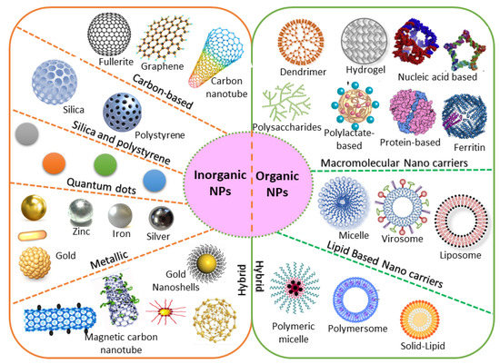NPs generally range in size from 1 to 100 nm and have either active or passive targeting capability, with a surrounding layer of several organic or inorganic coatings that determine the properties of NPs. These properties can increase the drug concentration inside the tumor and reduce systemic toxicity in healthy tissues. Several investigations have been performed to establish the benefits of NPs in DDSs for BC therapy with regard to water dispersion, biocompatibility, biodegradability, stability, half-life in the portal circulation, renal clearance, accumulation, and uptake [11,12]. Hence, DDSs are of key importance for understanding the responses to NPs by living systems at the level of cells and tissues. For instance, liposomes are bi-layered phospholipids that can encapsulate both hydrophilic and hydrophobic drugs. Indeed, engineered liposomes can preserve the drugs until they are disturbed, showing that liposomes can promote the sustained delivery of drug formulation. Moreover, they accumulate in cancer cells and increase the selectivity of the drug function, leading to diminished toxicity [75] (Figure 2).