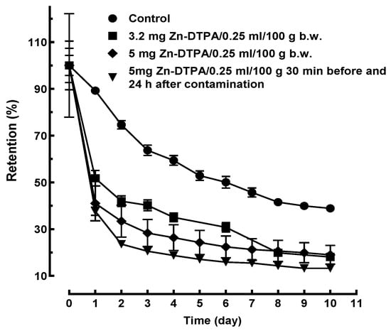 The retention of 65Zn is a resultant of the DTPA and its multiple complex pharmacokinetics. It has been reported that the retention of DTPA in the blood after intravenous administration can be described by three exponential components with half-times of 1.4 min (approximately 60%), 14.3 min (approximately 20%), and 95 min (approximately 20%), respectively [19]. Our experiments evaluated the total retention of 65Zn in the body following Zn-DTPA treatments and the first measurement was performed at 24 h. This would make it difficult to compare our data with reported results.