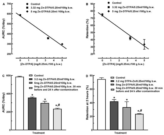 A global metric used to compare the pharmacokinetics curves is the area under the plasma concentration curve [18]. Similarly to this parameter, we calculated the area under the retention curve (AURC). We found a strong linear dependence of AURCs (Figure 3A, AURC = −59.51 × [Zn-DTPA] + 578.1, R2 = 0.980) and %Retention (Figure 3B, %Retention = −8.46 × [Zn-DTPA] + 73.46, R2 = 0.981) on the Zn-DTPA dose. The retention differences after two days showed similar sensitivity to the AURC-based metric, i.e., a two-fold decrease in the contamination at the 5 mg Zn-DTPA dose (Figure 3C,D). Notably, the administration of a second higher Zn-DTPA dose after 24 h following the contamination with 65Zn resulted in a significant decorporation efficacy compared to a single lower dose Zn-DTPA intervention (Figure 3C,D).