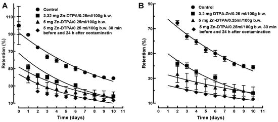 The retention data for the control groups were statistically similar for experiments 1 and 2 (data not shown). The retention data in the control group for experiment 2 being complete (i.e., for ten consecutive days), they were considered as a reference for both experiments. The decorporation of 65Zn by Zn-DTPA showed a remarkable time- and dose-dependence effectiveness (Figure 2).
