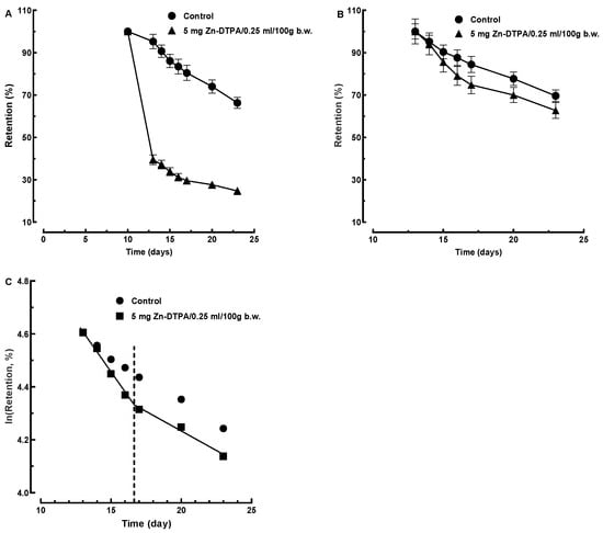 The logarithmic transformation of 65Zn retention data suggests an exponential process during the treatment and a change to another exponential process approximately between days 17 and 23 (Figure 6C). The fitting performance was good for both time intervals (R2 = 0.989 and R2 = 0.980, respectively). Our results suggest that the elimination of 65Zn occurs in two phases: a rapid elimination, seemingly from blood, during the first day, followed by a slower elimination, likely concerning the radionuclide that entered the tissues. The elimination from tissues includes a transfer across cellular membranes. We could hypothesize that 65Zn-DTPA and other complexes of 65Zn formed in the blood and/or in tissues transfer across the lipid membranes from the cellular cytoplasm to the blood [22]. Further research is warranted to address the transport of Zn complexes across biological membranes.