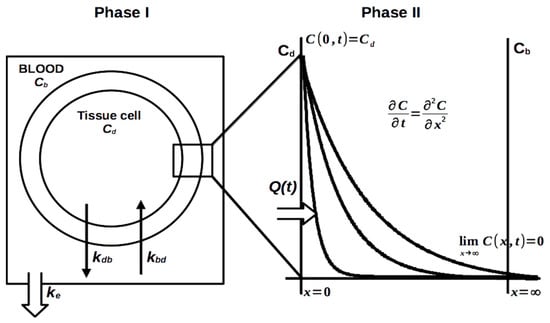 As phenomenological conditions, we considered that the tissue cells behave as an “infinite” reservoir with a constant concentration of Cd0, similar to a thermostat in the theory of heat transfer [30]. The transfer occurs across membranes. Since a Zn complex has higher solubility in water, its escape from membrane to plasma is rapid. The rate determining process is the diffusion inside the membranes. The associated mathematical problem is to solve the diffusion equation with the initial and boundary conditions C(0,t) = Cd0, C(x,0) = 0, (Figure 7, phase II).