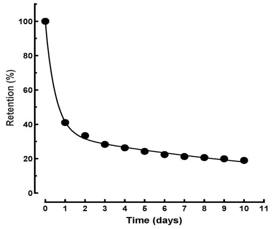 The retentions for each sampling time were normalized to the initial sampling time (i.e., t = 0) and calculated as percentage values. All data are presented as means ± standard errors (SEM). The relationships between the retention data and time were evaluated by linear or non-linear regression, and Pearson correlation analysis using GraphPad Prism 9.0 (GraphPad Software, Inc., San Diego, CA, USA). Comparisons among multiple groups were performed by one-way ANOVA with Newman–Keuls post hoc test, performed using GraphPad Prism 9.0. Two-tailed p values < 0.05 were considered statistically significant. All the pharmacokinetics parameters were evaluated using Kinetica 4.2 (InnaPhase, Inc., Philadelphia, PA, USA) software.