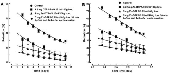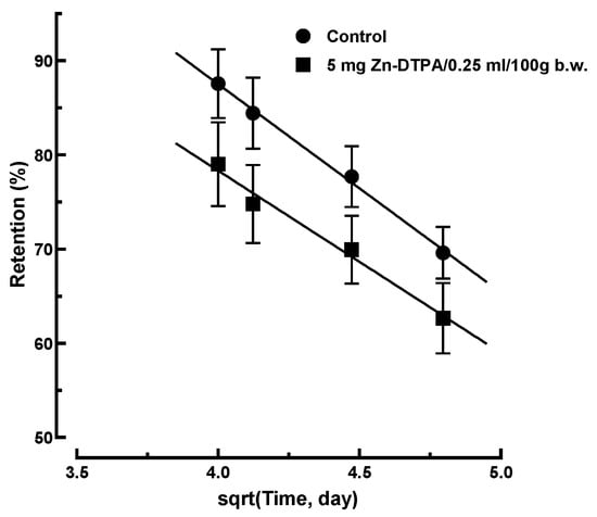 It is noteworthy that the controlled release from tissues by diffusion appears to be an increasingly reliable model as the process progresses over time. The predictions of the square-root model for the control group and the group treated with the higher dose of Zn-DTPA showed a remarkable fitting performance for the delayed intervention (Figure 10, %Retention = -19.4 × sqrt[Time, day] + 156, R2 = 0.983) when compared with the untreated group (Figure 10, %Retention = −22.1 × sqrt[Time, day] + 176, R2 = 0.997).