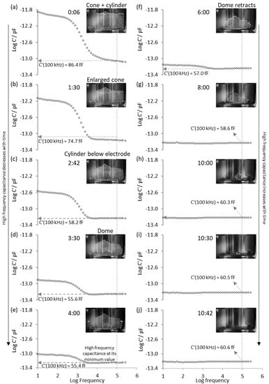 The third, and possibly unexpected observation, is that the magnitude of the real part capacitance () measured on the high frequency side of the relaxation process (in our case at a frequency of 100 kHz or a log frequency of 5) decreases from 86.4 fF at 0:06 h (6 min) to a minimum of 55.4 fF at 4:00 h and then increases to 60.6 fF at 10:42 h, and thereafter stays constant.