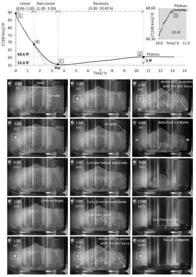 Figure 3 shows example spectra of the real part capacitance for the single (isolated) TVIS vial containing frozen water (ice) obtained at various time-points over the first 10–11 h of primary drying, alongside photographs of the shape/characteristics of the ice mass at the corresponding time points. Three observations can be made with respect to the progression of the sublimation process.