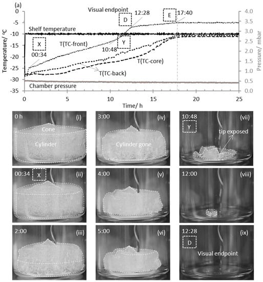 Determination of visual endpoint in the front edge vial containing a thermocouple and using this information to estimate the batch endpoint: (a) time-lines of the process parameters, namely the shelf temperature, the chamber pressure and the product temperature, T(TC-front), T(TC-back) and T(TC-core), at the bottom-center of the vial adjacent to each of the three TVIS vials located at the front edge of the shelf, the back edge of the shelf and in the core. Shown below this are photographs (i–ix) of the ice mass in the front TC vial taken at various time-points during primary drying. The labels X and Y enclosed by the dashed lines correspond to the inflections that indicate the detachment of the sensor from the ice layer in the immediate vicinity. The inflection at D and E correspond to the visual endpoint and the point at which all measurement vials reach equilibrium respectively.