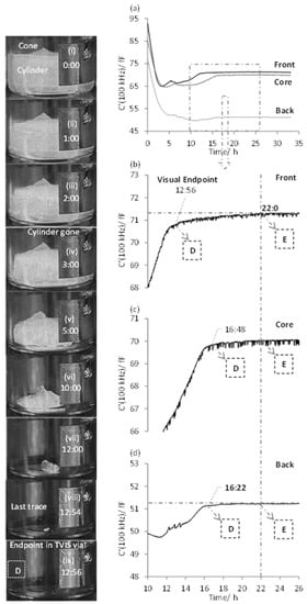 Next, we shall consider the timelines of the parameter for the front, core and back TVIS vials, alongside the photographs of the sublimation front in the front edge TVIS vial (Figure 6). Plot (a) is an overlay of all three timelines for the front, core and back TVIS vials (over the entire primary drying stage: 0 to 35 h) whereas plots b, c and d correspond to the timeline close to the end point for each TVIS vial (i.e., between 10 and 26 h into the primary drying stage). The time profiles of all three vials are similar in some sense. In each case there is a steep rise in the high frequency capacitance to a transition point D, after which there is a more gradual increase in the high frequency capacitance, before reaching a plateau at point E. The point E occurs at approximately the same time for all vials irrespective of the position in the dryer.