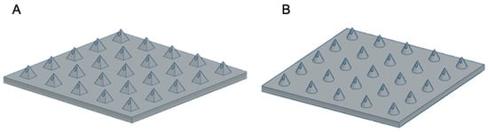 MN arrays were created online using free-access CAD software (TinkerCAD, USA). MN arrays were designed with a 15 × 15 × 0.5 mm base plate; needles were 1 mm in height for both Conical microneedles (CoMN) and Pyramidal microneedles (PyMN). CoMN had 1 mm base diameter and PyMN had 1 × 1 mm base and 0.25 × 0.25 mm bore diameters for both shapes, as shown in Figure 1. Designs were converted to .stl files and uploaded to the slicing software Asiga composer, imported MN designs were positioned at an angle of 0° and supports were added. Designs were printed at a resolution of 0.025 mm using PlasGRAY resin (Asiga, Alexandria, Australia). MNs were printed using the Asiga Max UV printer (Asiga, Alexandria, Australia). After printing was complete, the MN array was removed from the build plate and supporting structures were removed. The MN arrays were then immersed in Isopropyl Alcohol (IPA) and sonicated using the Ultrawave QS12 Ultrasonic Bath (Dorset, UK) for 3 min in order to remove any excess Plasgray from the model. After sonication, the arrays were removed from the IPA and left to air dry. After prints were dried, the prints were placed into a 385-nm UV chamber (Asiga Flash, Melbourne, Australia), where they cured for 20 min as recommended by the printer manufacturer.