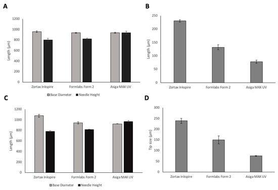 Base diameters and needle heights (A) and tip size (B) of 15 × 15 × 1 mm base 1 mm PyMN1 mm pyramidal (Py) needles; base diameters and needle heights (C) and tip size (D) of 15 × 15 × 1 mm base 1 mm conical (CoMN) needles printed using 3 different resin-based 3D printers.