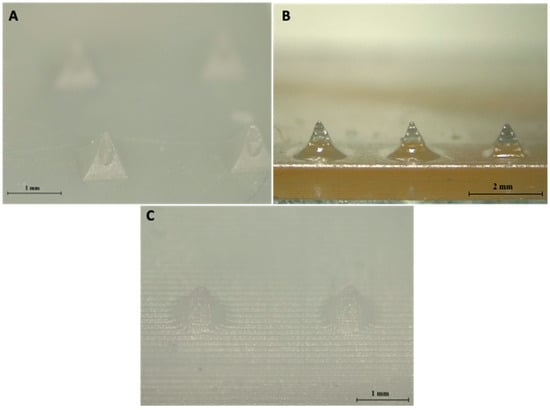 A Form 2 SLA-based 3D printer was used for the printing of MNs for comparison purposes. The same MN designs shown in Figure 1 were imported onto the slicing software associated with the Form 2 printer, Preform (Formlabs, Somerville, MA, USA). MN designs were oriented at a 45° angle and supports added with a touchpoint size of 0.4 mm and density of 1. The processed designs were then exported as .stl files to the printer and printed using Dental SG resin at the resolution of 0.050 mm. Post printing, the MN arrays were removed from the printing platform and detached from the supporting structures. The arrays were then washed in IPA to remove any excess unpolymerized resin and cured under UV light at 40 °C for 60 min using an UV-A chamber (MeccatroniCore BB Cure Dental station, North Yorkshire, UK) at a wavelength of 405 nm.