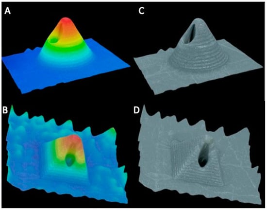 VH-700F digital microscope images of 3D reconstruction of MNs with colour scale, CoMN (A) and PyMN (B), and without colour scale, CoMN (C) and PyMN (D).