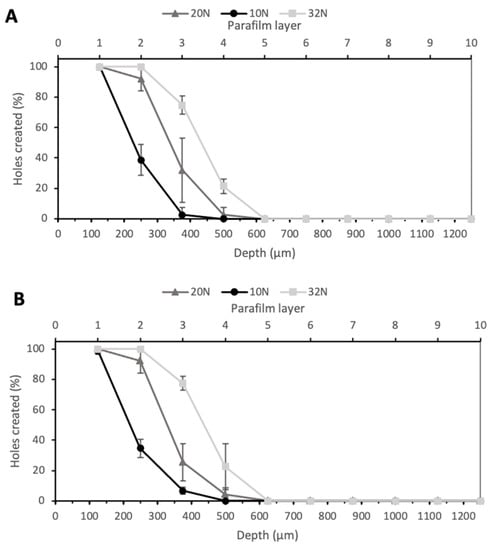 Percentage of holes created in Parafilm layers at 10, 20, and 30 N for PyMN (A) and CoMN (B).