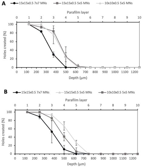 Another noticeable aspect was that the insertion depth was also dependent on the number of MNs in the array or, more importantly, the spacing between needles on the array. Figure 6 shows the insertion depth obtained for 7 × 7 arrays with PyMN (A) and CoMN (B) at a force of 32 N. The 15 × 15 × 0.5 7 × 7 PyMNs were able to pierce one Parafilm layer less than the 5 × 5 devices with the same MN geometry and showed a significant difference between the numbers of holes created (p < 0.05). On the contrary, for the CoMN, the difference in the insertion depth between the 5 × 5 and 7 × 7 arrays was not very significant (p > 0.05). When looking at the 5 × 5 needle arrangement on a smaller base plate size of 10 × 10 × 0.5, in PyMN, a similar insertion depth to the 5 × 5 arrangement on a 15 × 15 × 0.5 mm base plate was seen. For CoMN arrays, the smaller base plate size resulted in a slightly lower number of holes created in the third layer in comparison with the 15 × 15 × 0.5 mm base plate. This shows that the when the needles had greater spacing between them, such as in the 5 × 5 arrangement, the MN arrays were able to insert to a higher insertion depth than needles that were spaced more closely together. Therefore, to ensure the optimal insertion capabilities of the MN arrays, a 15 × 15 × 0.5 mm base plate with 5 × 5 needles was chosen for further studies.