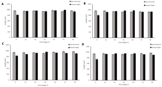 The effect of angle of print on needle height and base diameter of Solid PyMN (A), Solid CoMN (B), Hollow PyMN (C), and Hollow CoMN (D).