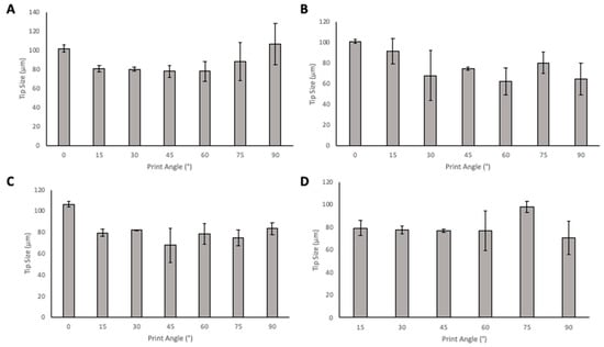 The effect of angle of print on tip size of Solid PyMN (A), Solid CoMN (B), Hollow PyMN (C), and Hollow CoMN (D).