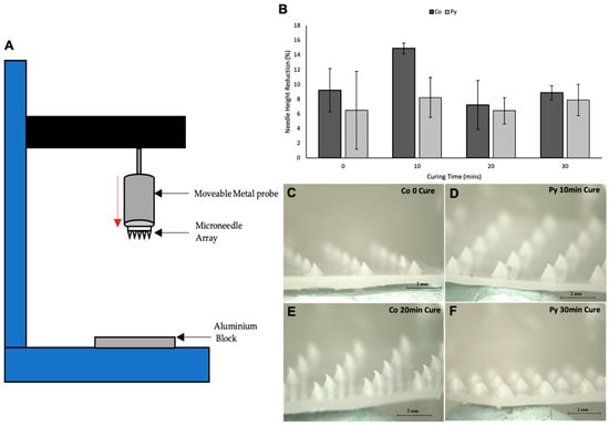Set up of texture analyser for mechanical testing of MN arrays (A). Graph showing the percentage reduction in needle height after mechanical testing of CoMN- and PyMN-shaped arrays (B). Light microscope images after mechanical testing of CoMN 0 min cure (C), PyMN 10 min cure (D), CoMN 20 min cure, and (E) PyMN 30 min cure (F) MN arrays.