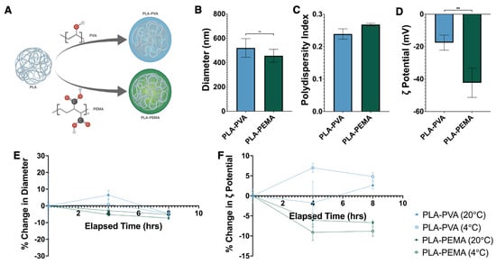 iNPs were prepared using PLA by the single emulsion-solvent evaporation method (Figure 1A) with two surfactants—PVA or PEMA. The iNPs produced were similar in size with diameters between 400–600 nm (Figure 1B) with low polydispersity indices (PDI) (Figure 1C). In contrast to size, the zeta potentials of iNPs were significantly different, where PLA-PVA were approximately −17 mV and PLA-PEMA were approximately −40 mV (Figure 1D). We performed additional studies aimed to determine the stability of iNPs following reconstitution in deionized water over 8 h under various storage temperatures []. Both PLA-PVA and PLA-PEMA showed less than 10% change in size (Figure 1E). Similarly, the zeta potential of iNPs remained stable with less than 10% variability over 8 h (Figure 1F). Both iNP formulations displayed similar stabilities independent of reconstitution and storage at room temperature or refrigeration.