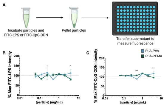 PLA iNPs (concentrations of iNPs as described in the results) were incubated with 1 µg/mL ODN 1668 FITC or 1 µg/mL FITC LPS in sterile DPBS containing 10% heat inactivated fetal bovine serum (FBS). These samples were incubated for 1 h at 37 °C at 5% CO2 and vortexed every 10 min. Following incubation, the solutions were centrifuged for 5 min at 12,000× g to pellet iNPs then the supernatant was transferred to black 96-well plates to measure fluorescence at 525 nm with the Molecular Devices (San Jose, CA, USA) SpectraMax iD3 Microplate Reader.