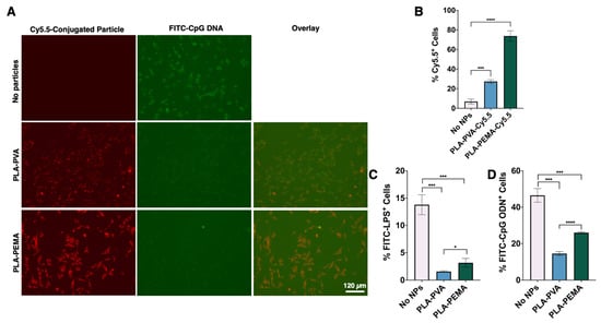 PLA-PVA and PLA-PEMA particle formulations show similar behavior when interacting with TLR agonists and cells with the exception being the increased propensity of PLA-PEMA particle uptake by cells. (A) Fluorescence microscopy establishes that PLA-PEMA-Cy5.5 interact to a greater extent with BMMΦs than PLA-PVA-Cy5.5. (B) Quantification with flow cytometry after 1-hr co-incubation at 37 °C and 5% CO2 confirms cells associate to a greater extent with PLA-PEMA-Cy5.5 particles (30 µg/mL) than PLA-PVA-Cy5.5 particles (30 µg/mL). Both PLA-PVA (300 µg/mL) and PLA-PEMA (300 µg/mL) treatments result in dramatic decreases in BMMΦ cellular uptake of (C) FITC-LPS (100 ng/mL) and (D) FITC-CpG ODN (100 ng/mL) following 18-hr incubation at 37 °C and 5% CO2. Statistical differences between groups were determined by performing a Student’s t-test. Error bars represent SD. * for p ≤ 0.05, *** for p ≤ 0.001, and **** for p ≤ 0.0001.