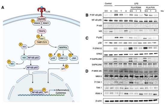 PAMPs engage their respective TLRs and initiate complex signaling cascades that eventually lead to the production of cytokines and chemokines and expression of costimulatory molecules that eventually lead to widespread inflammation []. Because these signaling cascades are dependent upon activation of key transcriptional nodes, we next investigated the impact of LPS-mediated TLR4 stimulation via activation of the NF-κB p65 transcription factor and p38 MAPK (Figure 4A). In both signaling pathways, phosphorylation of p65 and p38 signifies engagement and activation of the upstream TLRs. To investigate the effects of iNPs, we first incubated the BMMΦs with iNPs prior to LPS stimulation for 0.5, 1, and 4 h to assess the activation of these key signaling pathways. Figure 4B shows that both PLA-PEMA and PLA-PVA decrease the phosphorylation of p65 compared to no particle treatment. Importantly, the decrease in phosphorylation in the case of PLA-PEMA treatment occurs earlier than that seen in PLA-PVA, suggesting that the more extensive uptake of PLA-PEMA compared to PLA-PVA (Figure 3A,B) plays a role in mediating this protective effect against activation of proinflammatory signaling cascades. Along with this, incubation with either PLA-PEMA or PLA-PVA alone results in no alteration in phosphorylation of either p65 nor a decrease in the total amount of the protein (Supplemental Figure S4). We next probed for MAPKs (Figure 4C). MAPKs are key in that they are activated by different stimuli (including LPS), yet p38, ERK1/2, and SAPK/JNK all have the capacity to phosphorylate transcription factors that form the AP-1 complex, a key regulator of the transcription of inflammatory cytokines [,]. We can see that phosphorylation of p38 is decreased secondary to LPS stimulation when treated with iNPs and that this result is opposite to that seen with phospho-ERK1/2 and phospho-JNK. Interestingly, when we evaluate the effects of iNP treatment on MAPK activation alone, we see that iNPs stimulate phosphorylation of ERK1/2, an effect not seen with the other probed MAPKs (Supplemental Figure S4). Finally, an investigation of upstream signaling components shows no decrease in phosphorylation of MKK3, MKK6, and TAK1, nor total levels of IRAK4 suggesting that the iNP-mediated effects downstream of LPS stimulation are limited to NF-κB p65 and p38 MAPK (Figure 4D). These data suggest that the iNP-based modifications to the BMMΦs are inherent to their capacity to respond to an inflammatory trigger rather than some basal change to the BMMΦs.