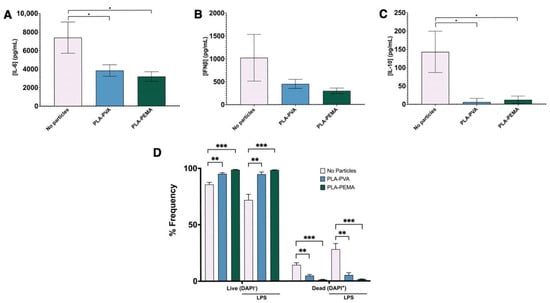 Furthermore, to establish that these transcription changes result in functional changes to the BMMΦs, we used Luminex to establish that these changes in transcription factor activation also resulted in a decrease in cytokine secretions. Indeed, we confirmed this across a multitude of signaling pathways including NF-κB-dependent IL-6 (Figure 5A), IRF3-dependent IFNβ (Figure 5B) [], and the transcriptionally complex IL-10 (Figure 5C) []. Similar experiments conducted with murine macrophage-derived RAW 264.7 cells confirmed iNP-dependent decreases in IL-6 with iNPs following LPS stimulation (Supplemental Figure S5). Interestingly, PLA-PVA treatment resulted in an increase in TNF-α secretion with iNP treatment, while the opposite effect was observed with PLA-PEMA. Additionally, another potential consequence of iNP treatment is the induction of cell death driving the decrease in transcriptional activation and proinflammatory cytokines. We used flow cytometry and cell exclusion dye to establish that our iNPs do not induce cell death and can increase cell survival in the setting of LPS stimulation of BMMΦs (Figure 5D). When taken together, iNPs can drive changes in the function of BMMΦs through reprogramming of transcriptional activation. This leads to decreased proinflammatory cytokine secretions and also aids in extending survival of this cell population.