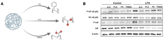 Suppression of NF-κB p65 is dependent upon lactic acid polymer of the particles. (A) BMMΦ cells treated with soluble lactic acid (sLA), or nanoparticles composed of PLA-PEMA (PLA), polystyrene-COOH (PS), or poly(methyl methacrylate) (PMMA), for 3 h followed by 1 h LPS stimulation to show differential activation of p65 and greater baseline degradation of IκB compared to sLA and LPS alone following particle incubation and 1h LPS stimulation. (B) Samples were immunoblotted for phospho-NF-kB p65 (Ser536), total NF-kB p65, phospho-IκB (Ser32), total IκB, and β-actin. Schematic in (A) created with BioRender.