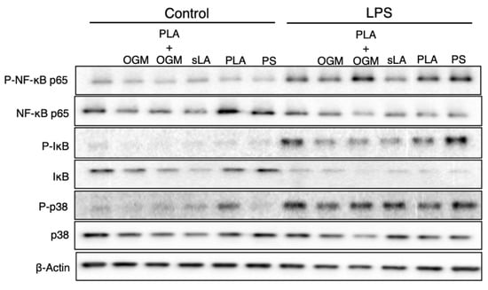 GPR68 inhibition with OGM reverses lactate-mediated suppression of NF-κB p65 activation. BMMΦ cells were treated like previously with soluble lactic acid (sLA) or nanoparticles composed of PLA-PEMA (PLA) or polystyrene-COOH (PS). The addition of OGM, a GPR68 inhibitor, reverses the inhibition of p65 activation seen with PLA following particle incubation and 1-hr LPS stimulation. Samples were immunoblotted for phospho-NF-κB p65 (Ser536), total NF-κB p65, phospho-IκB (Ser32), total IκB, phospho-p38 (Thr180/Tyr182), total p38, and β-actin.