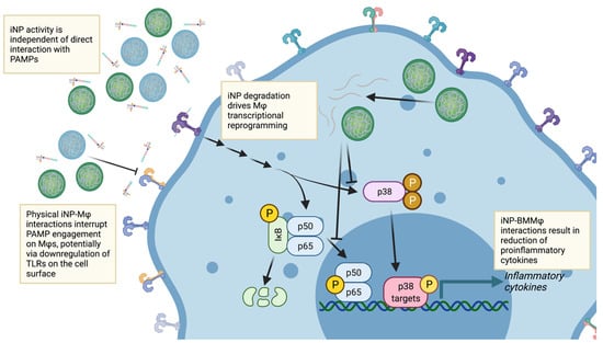 iNPs invoke multiple physical and biological mechanisms to elicit a protective effect in BMMΦs. iNPs interact with BMMΦs to interrupt the engagement of PAMPs on TLRs at both the cell surface and endosomal surface, thus limiting the activation of TLR signaling networks. However, if LPS engages TLR4, the iNPs function via a secondary mechanism whereby their degradation triggers BMMΦ transcriptional reprogramming in response to LPS. This reduces the overall activation and production of inflammation mediators resulting in an overall protective effect to PAMP challenge. Schematic created with BioRender.