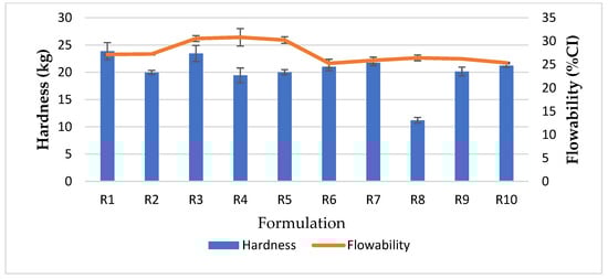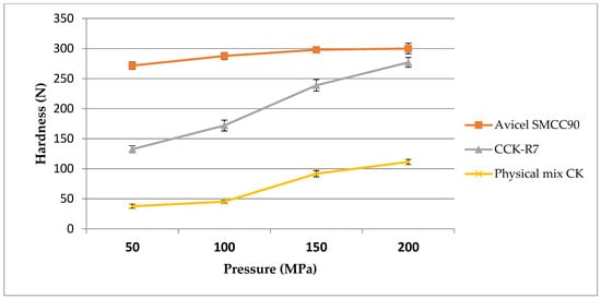 The compactibility of samples was evaluated based on the hardness of the tablets. The optimum compression force can provide excellent tablet hardness. Hardness assesses the endurance of tablets to withstand breakage, chipping, or friability under the conditions of storage, transportation, and handling [1]. Generally, tablet hardness is dependent on the type and concentration of the binder, tablet diameter, and compression force.