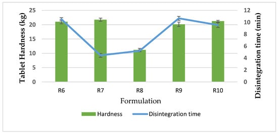 The chitosan to kaolin ratio was adjusted by varying the amount of chitosan at 50:50, 55:45, 45:55 and 40:60, respectively (R6, R7, R9, R10); the chitosan/TPP ratio was fixed at 20:1. The physical properties of flow character and tablet hardness were similar. Of note, the compressed tablets of R7 disintegrated quickly (within 5 min) although the tablet strength was not significantly different, as shown in Figure 2.