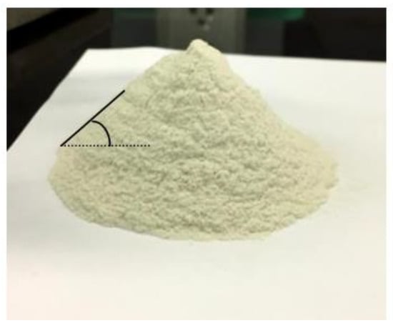 Co-processed chitosan–kaolin R7 (CCK-R7) was considered the most suitable formulation for a novel tablet excipient as it showed significantly enhance tablet hardness, true density, powder flowability and disintegration time, compared to the other formulations. Co-processed chitosan–kaolin R7 contained 55% chitosan (chitosan/TPP mass ratio 20:1) and 45% kaolin. The powder was slightly yellowish. In the fixed funnel method, CCK-R7 was poured through a funnel to form cone, the angle of the resulting cone was directly measured as illustrated in Figure 3. Spray drying was continuously operated to produce the CCK-R7 for further evaluation and compared with Avicel SMCC90®.