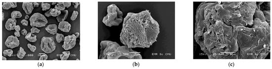 The shape and surface topography of CCK-R7 were examined by SEM at different magnifications. The morphology of the spray dried powder is presented in Figure 4. The particles showed an irregular shape, rough surface and chitosan filaments were observed on the outer layer of the particles. Chitosan particles crosslinked with TPP was a critical factor leading to particle deformation. Previous studies [25,31] also reported that the TPP cross-linking interaction affects the particle morphology of spray dried chitosan–TPP, in which the higher cross-linking ratio resulted in a smoother surface with a buckled structure or collapsed characteristic of skin-forming spray dried materials.