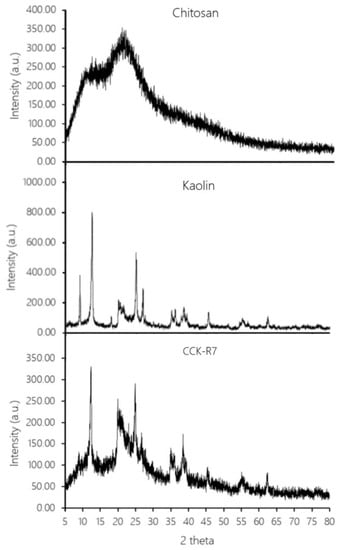 X-ray diffraction patterns of chitosan, kaolin and CCK-R7.