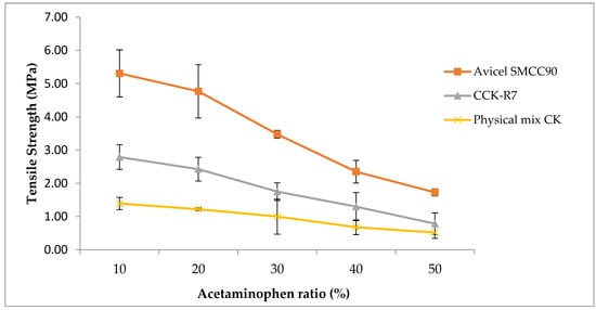 Tablet tensile strength versus the percentage of acetaminophen using Avicel SMCC90®, CCK-R7, and the physical mixture of chitosan and kaolin.